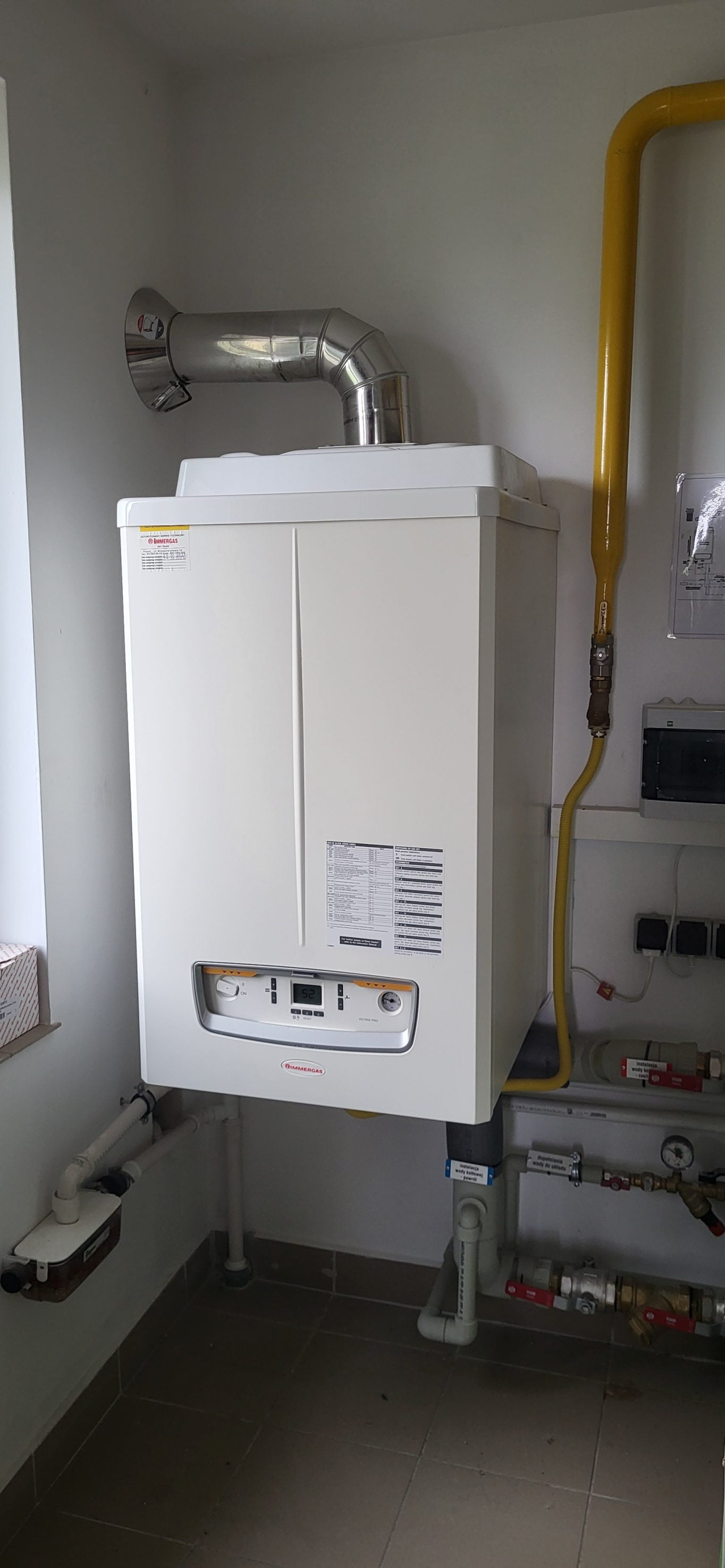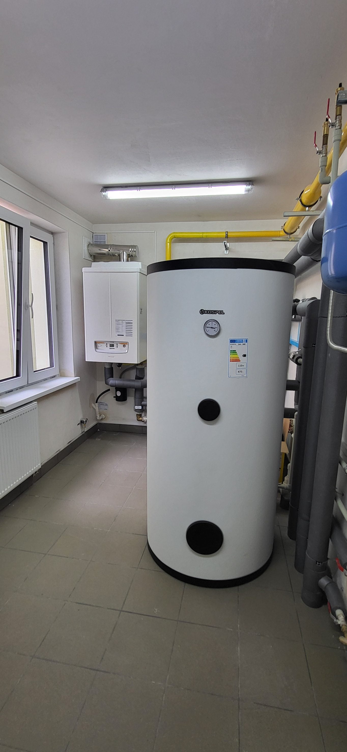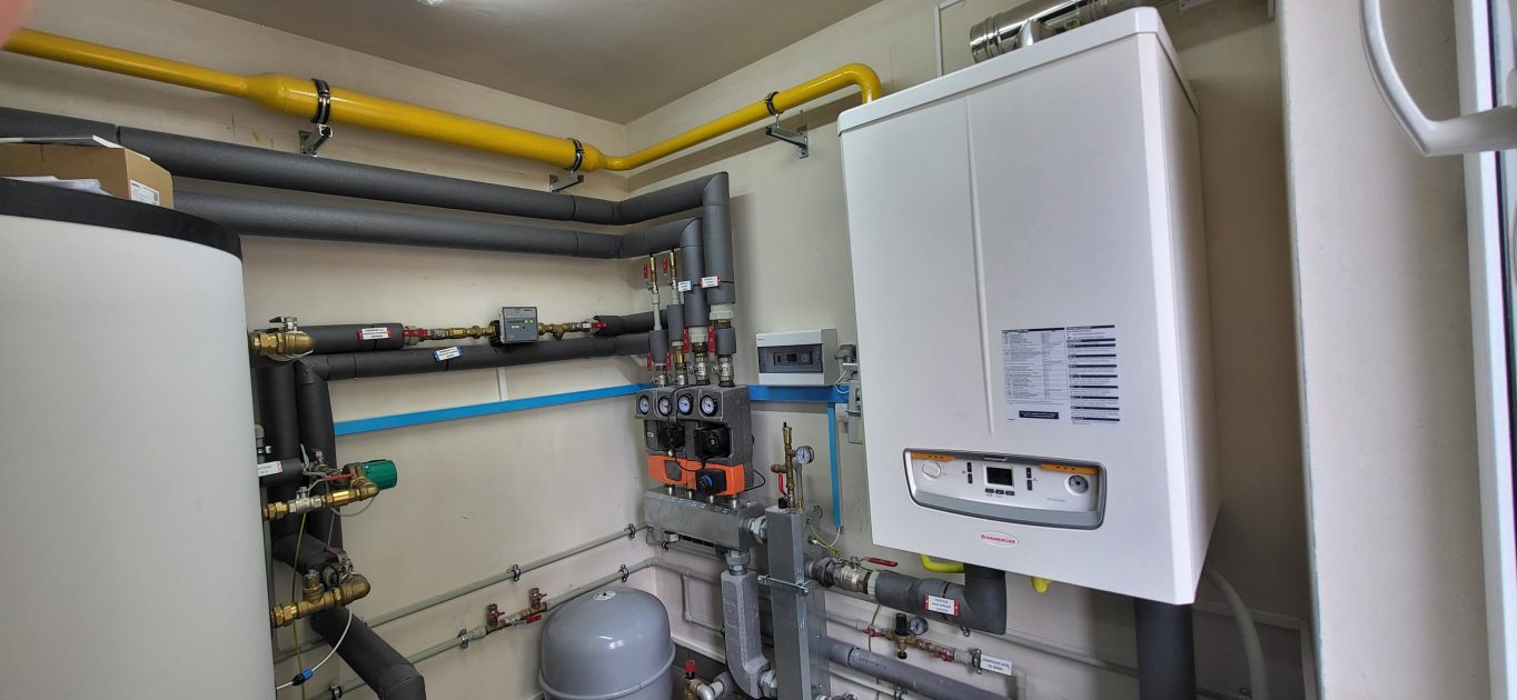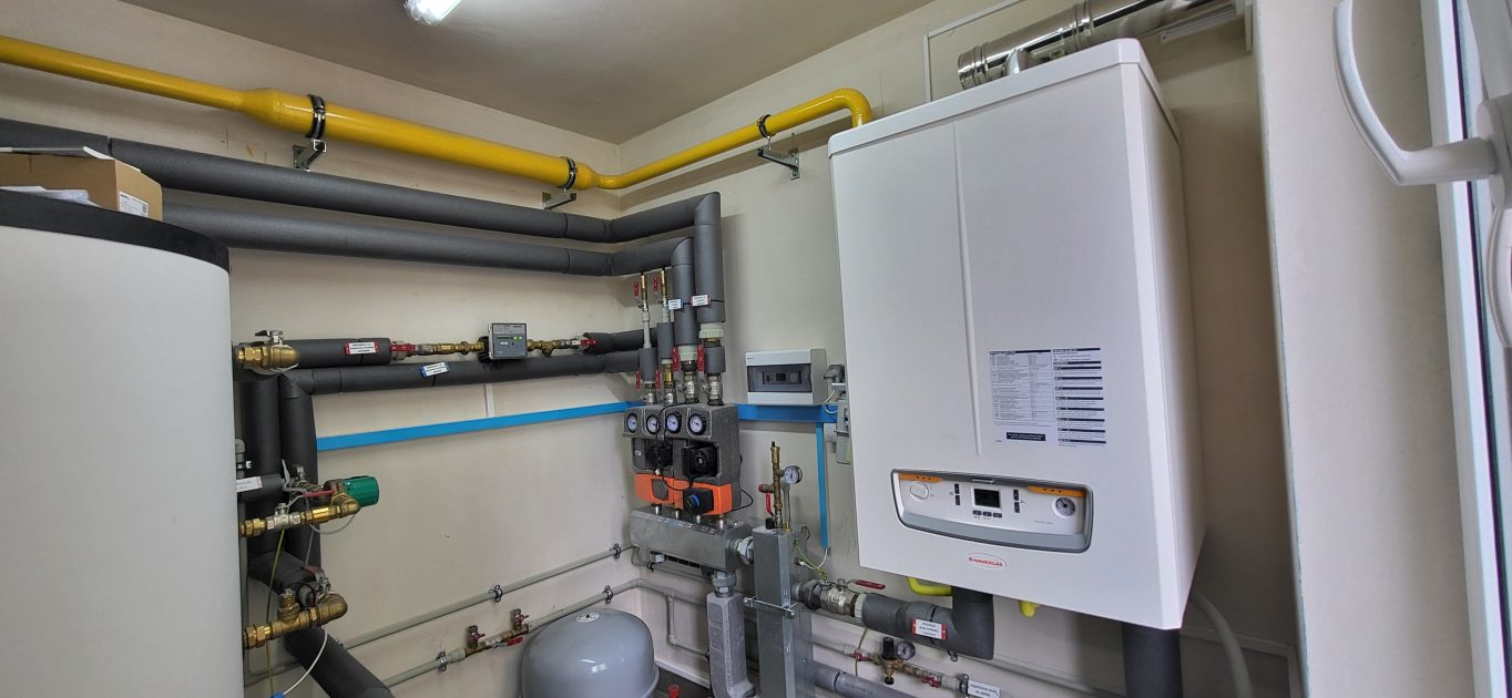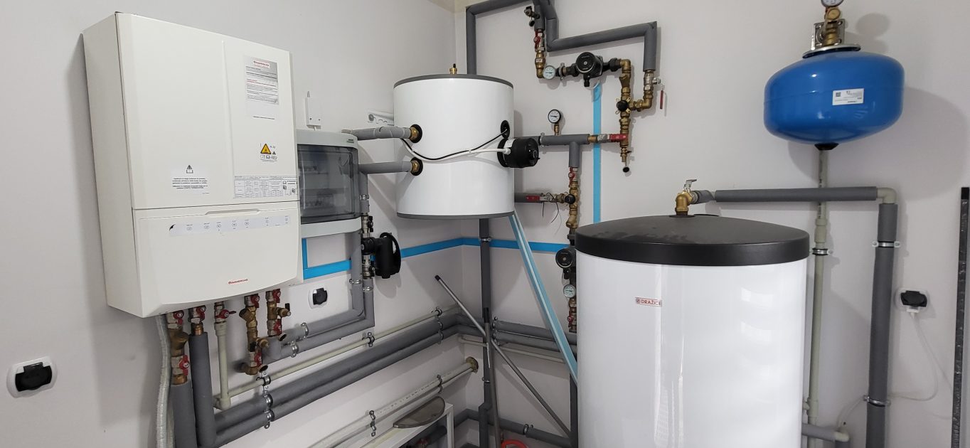 Kotłownia na nowym osiedlu. Cztery budynki wielorodzinne, po 19 lokali. Każdy budynek zasilany jest przez pojedynczy kocioł Victrix PRO 100 kW, do realizacji CWU współpracuje z zasobnikami po 500 L każdy.