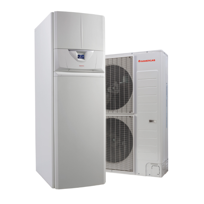 Powietrzna pompa ciepła typu split składająca się z jednostki zewnętrznej oraz jednostki wewnętrznej z wbudowanym buforem c.o. oraz zasobnikiem c.w.u.