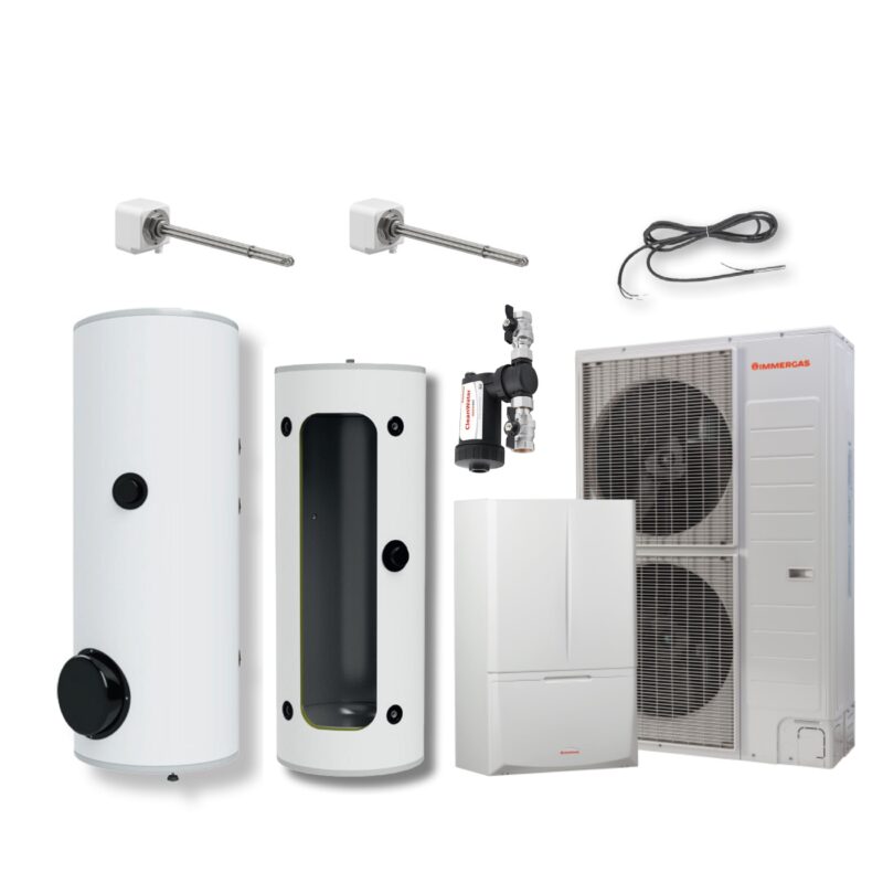 Magis PRO 16 V2 T M300 B250 to zestaw składający się pompy ciepła typu split Magis PRO 16 V2 T I, zasobnika c.w.u. o pojemności 300l z grzałką zasilaną jednofazowo o mocy 2,5 kW a także bufor do c.o. o pojemności 250l z grzałką zasilaną trójfazowo o mocy 6,0 kW. Dodatkowo zestaw zawiera sondę do zasobnika, filtr magnetyczny z zaworami i zestaw ochrony antyzamrożeniowej do jednostki zewnętrznej (zainstalowany fabrycznie).